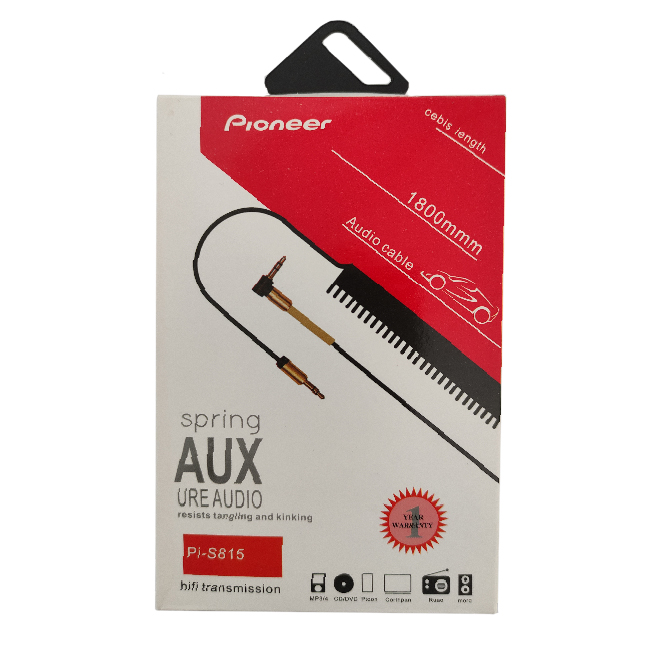 کابل AUX پاییونیر مدل Pi-S815 به طول 1.8 متر با یک کانکتور قائم که مانع از قطع شدن آن می شود، طراحی شده است. این کابل به صورت فنری تولید شده که از گره خودن و در هم پیچیدگی آن جلوگیری می شود.