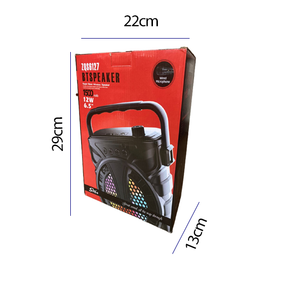 اسپیکر پرتابل ZQS 6127 با 12وات و 5 ولت توان قابلیت پخش موسیقی با کیفیت بالا را دارد و با وزن 0.9 کیلوگرم به راحتی قابل حمل می باشد.