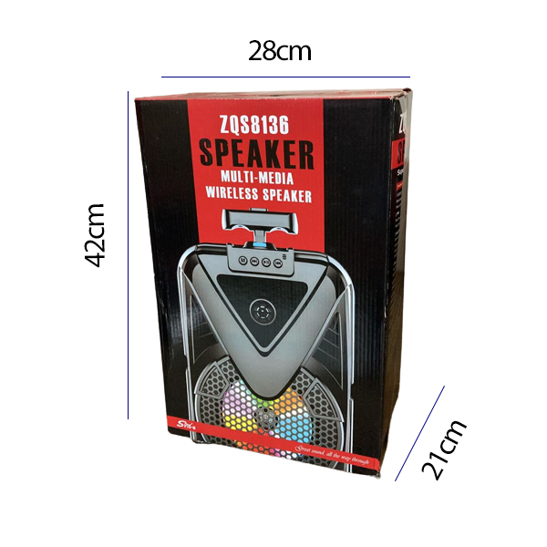 اسپیکر پرتابل ZQS 8136 با 15 وات و 5 ولت توان قابلیت پخش موسیقی با کیفیت بالا را دارد و با وزن 2.7 کیلوگرم به راحتی قابل حمل می باشد.