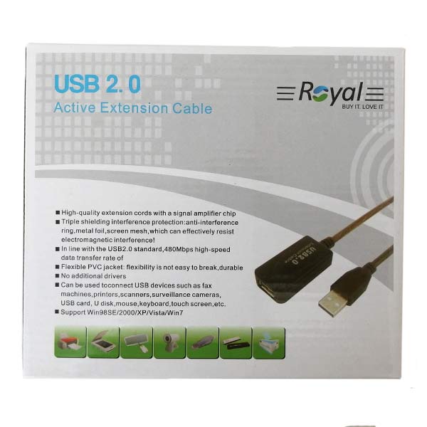 کابل افزایش طول رویال برد دار مدل 038 طول 20 متر برای اتصال کابل های USB در فواصل طولانی مورد استفاده قرار می گیرد. این کابل به دلیل طول زیاد، نیاز به یک تقویت کننده دارد تا با مشکل قطعی اتصال و یا کاهش سرعت مواجه نشود. بنابراین آن را به صورت برد دار طراحی کرده اند.