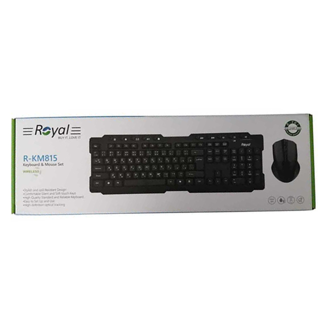 کیبورد و ماوس بیسیم رویال مدل KM-815 از طریق دانگل USB به کامپیوتر شما متصل می شود. ماوس این محصول دارای دقت 1600dpi و حسگر اپتیکال بوده و با 3 عدد کلید طراحی شده است. همچنین این کیبورد دارای 115 عدد کلید می باشد.