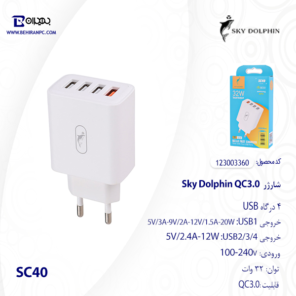 شارژر دیواری Sky Dolphin QC3.0 32W مدل SC40 عدد