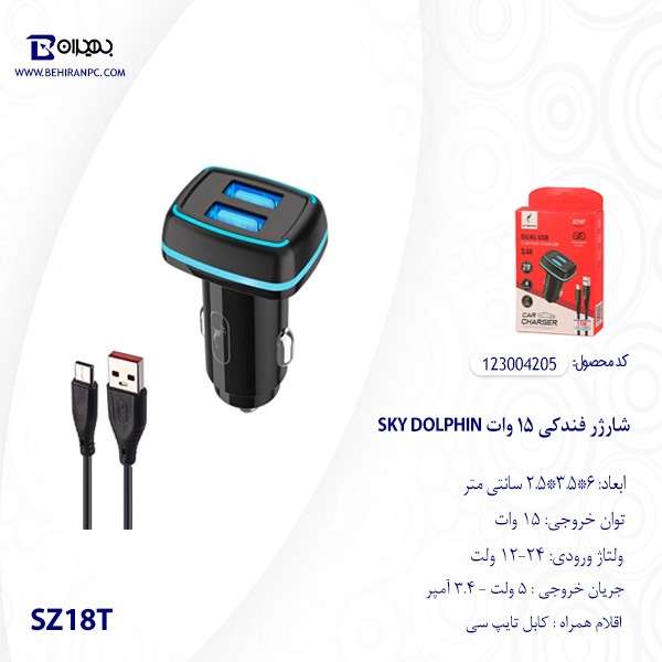 شارژر فندکی دو پورت Sky Dolphin مدل SZ18T به همراه کابل Type-C عدد