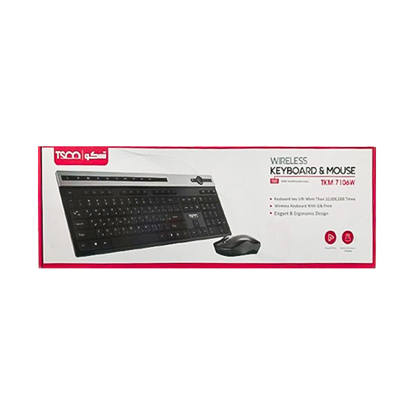 کیبورد و ماوس تسکو مشکی مدل TKM7106W FH با اتصال بی سیم و برد ۱۰ متر یک گزینه مناسب برای انجام امور اداری و خانگی است. طراحی این ماوس و کیبورد به گونه ای است که در استفاده طولانی از آن، خسته نخواهید شد.