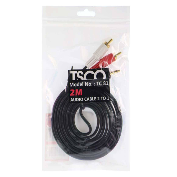 کابل 1 به 2 صدا تسکو مدل TC81 به طول 2 متر با روکشی از جنس PVC تولید شده است و دارای یک پورت ورودی جک 3.5 میلیمتری صدا و دو سر خروجی RCA است.