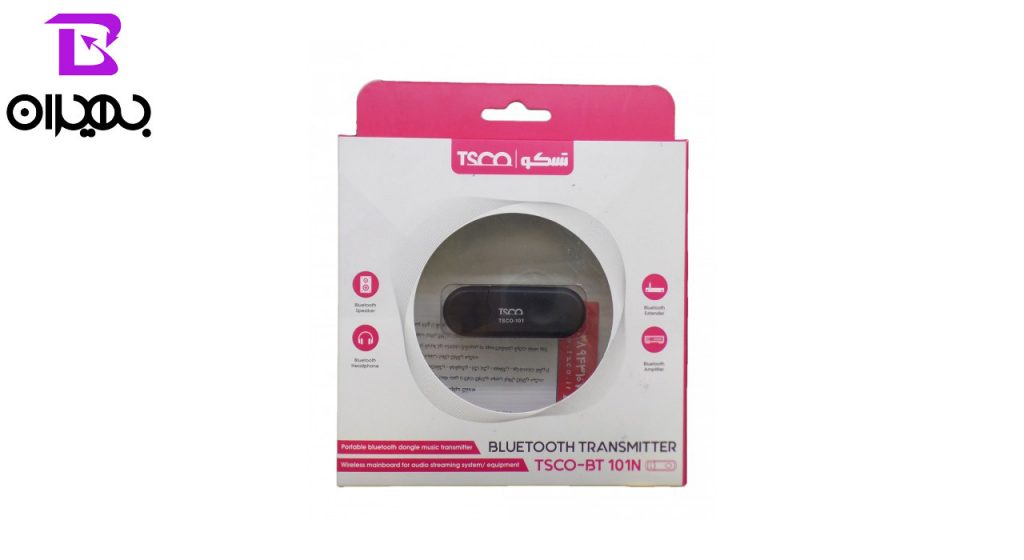 دانگل بلوتوث تسکو مدل BT 101N جهت اتصال تلوزیون به اسپیکر و یا هدست بلوتوثی و موارد مشابه مورد استفاده قرار می گیرد. برای انتقال صدا از تلویزیون به اسپیکرهای بلوتوثی و… باید پورت USB را به منبع تغذیه (آداپتور -۵v) متصل کنید ، سپس کابل AUX یا صدا را به دستگاه دانگل بلوتوث و همچنین به خروجی دستگاه فرستنده مانند ( TV, …….) وصل کنید.