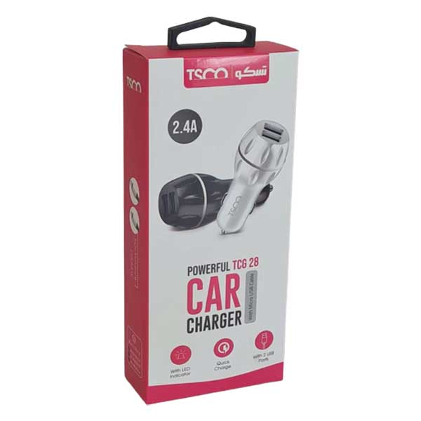شارژر فندکی تسکو مدل TCG 28 دو پورت با ولتاژ ورودی ۱۲-۲۴ ولت، ولتاژ خروجی ۵ ولت و شدت جریان خروجی ۲٫۴ آمپر می تواند برای شما امکان شارژ موبایل و تبلت در سفر با خودرو را فراهم کند. این شارژر دارای دو پورت USB جهت شارژ همزمان موبایل یا تبلت است.