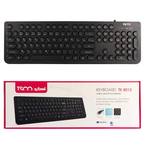 کیبورد تسکو مدل TK 8013 طراحی زیبا و جذابی دارد و برای انجام کارهای روزانه شما با کامپیوتر مناسب است. این کیبورد به صورت سیمی و از طریق پورت USB به کامپیوتر شما متصل می شود. تعداد کلید ۱۰۴ عدد بوده و در مقابل رطوبت هوا، مقاوم است.