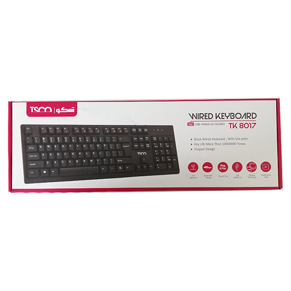 کیبورد تسکو مدل TK 8017 از طریق پورت USB و با کابلی 180 سانتی متری به کامپیوتر شما متصل می گردد. این کیبورد دارای 104 کلید بوده که حروف فارسی روی آن حک گردیده است.