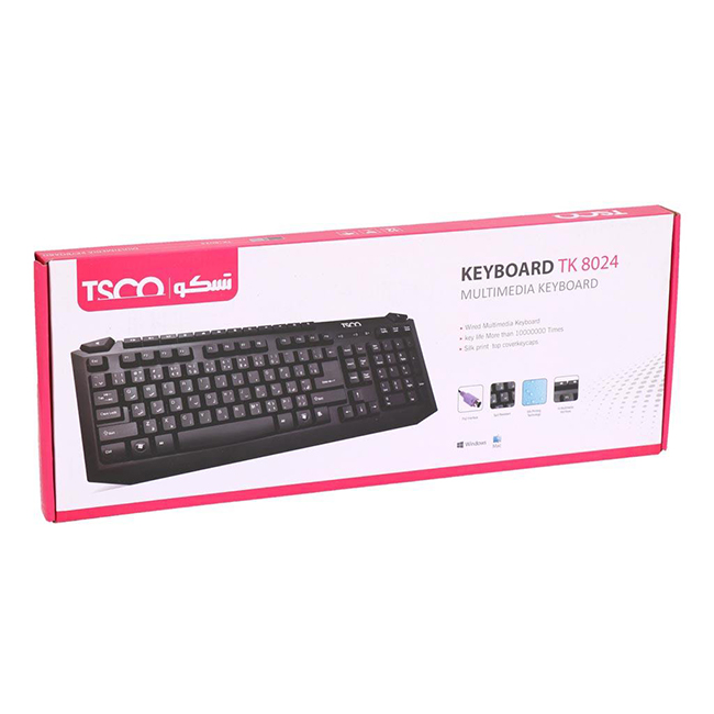 کیبورد تسکو مدل TK 8024 به صورت سیمی تولید شده است که و از طریق پورت PS2 به کامپیوتر شما متصل می شود. این کیبورد دارای ۱۱۸ کلید با حروف فارسی حک شده است و در مقابل گرد و غبار، رطوبت و نفوذ مایعات مقاوم است.