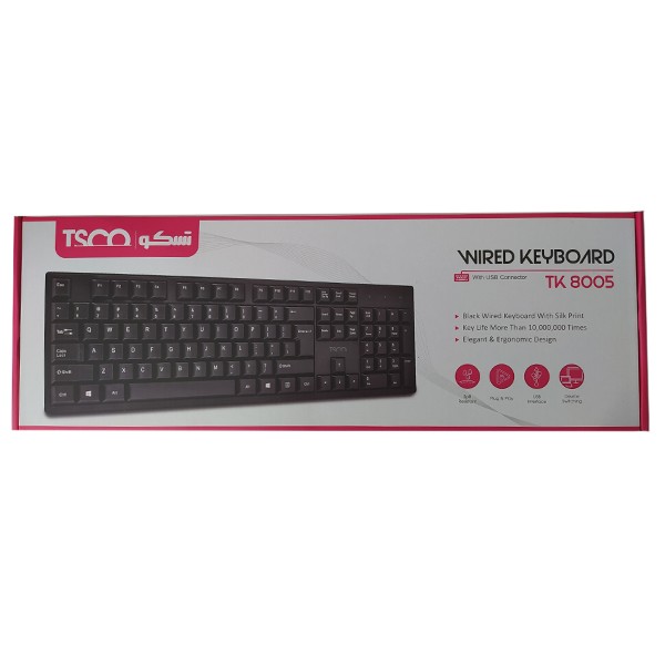 کیبورد تسکو مدل TK8005 یک صفحه کلید استاندارد با 104 عدد کلید است که برای استفاده روزانه در محل کار یا منزل مناسب است. علاوه ب حروف انگلیسی، حروف فارسی نیز به صورت واضح بر روی کلیدهای این کیبورد حک شده است.
