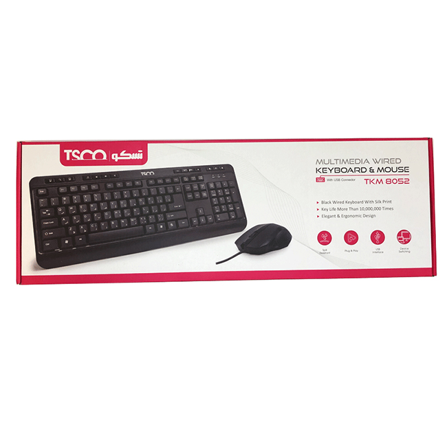نوع اتصال کیبورد و ماوس تسکو مدل TKM 8052 به صورت سیمی و از طریق پورت USB می باشد. این کیبورد دارای ۱۰۵ کلید با برچسب حروف فارسی و تعداد کلیدهای ماوس آن ۳ عدد است. حسگر این ماوس اپتیکال و دقت آن ۱۰۰۰dpi است. از این ماوس می توانید با هر دو دست استفاده کنید.