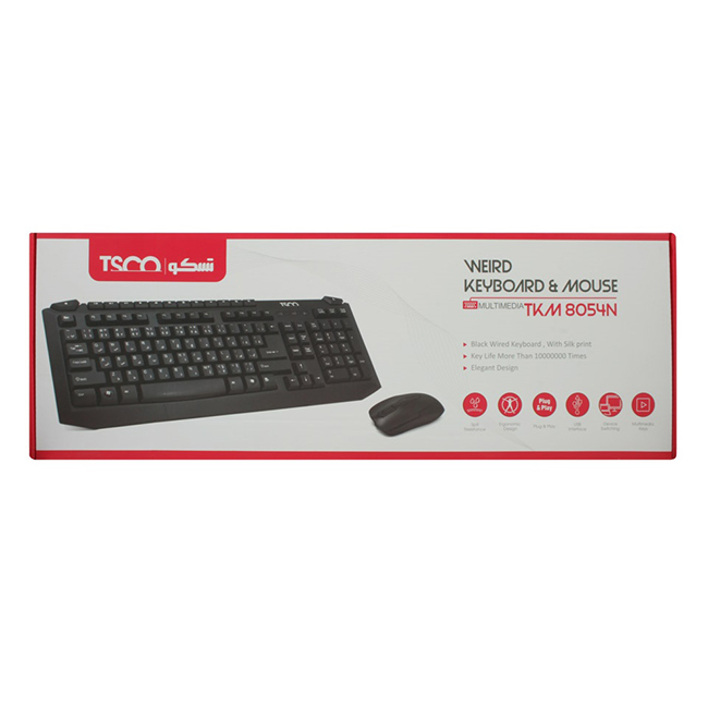 کیبورد و ماوس تسکو مدل TKM 8054N با حروف فارسی به صورت سیمی به کامپیوتر یا لپ تاپ شما متصل می شود. این ماوس و کیبورد تسکو با تمامی سیستم عامل ها مثل ویندوز و مکینتاش سازگار بوده و طوری ساخته شده که در برابر ضربه و رطوبت مقاوم است. نوع رابط ماوس و کیبورد عرضه شده توسط شرکت تسکو با USB2.0 است.