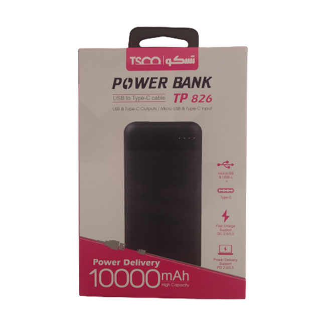 شارژر همراه تسکو مدل TP 826 ظرفیت 10000 میلی آمپر ساعت با یک باتری لیتیوم پلیمری با محدوده ظرفیت بیش از 6 تا 11 هزار میلی آمپر ساعت وزن معمولی 200 تا 400 گرم(220گرم) به ابعاد 137*69*15.5 میلی متر به شکل مستطیل از جنس بدنه پلاستیک ABS مقاوم در شرایط سخت ساخته شده است و با ظرفیت نسبتا بالایی که دارد امکان شارژ گوشی موبایل را به دفعات مکرر برای ما فراهم می کند.