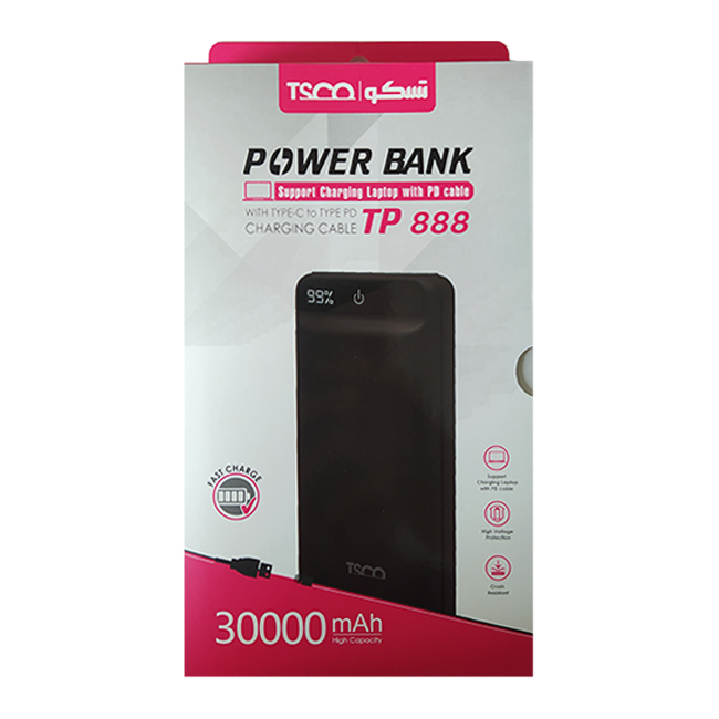 شارژر همراه تسکو مدل TP 888 ظرفیت 3000MAH دارای دو پورت خروجی USB، یک پورت ورودی MicroUSB و یک پورت ورودی و خروجی Type-C می باشد. این شارژر همراه دارای یک باتری لیتیوم پلیمری با ظرفیت 30000 میلی آمپر ساعت است که توسط ورودی Type-C بین 9-10 ساعت و توسط پورت MicroUSB بین 16-17 ساعت شارژ می شود.