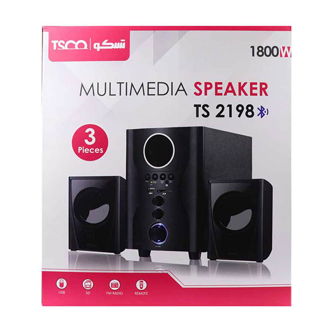 اسپیکر تسکو مدل TS 2198 یک اسپیکر رومیزی بلوتوثی است و شما می توانید به راحتی از طریق بلوتوث، آن را به موبایل، تبلت و هر وسیله مجهز به بلوتوث متصل کنید. علاوه بر این می توانید توسط درگاه USB و شیار کارت حافظه نیز می توانید بین دستگاه خود و این اسپیکر اتصال برقرار کنید. اجزای اسپیکر تسکو مدل TS 2198 شامل یک عدد ساب ووفر و دو عدد اسپیکر بوده که روی ساب ووفر نمایشگر LED تعبیه شده است. توان خروجی ۲۵ وات و حساسیت ۶۵ دسی بل از دیگر ویژگی های این محصول تسکو می باشد.