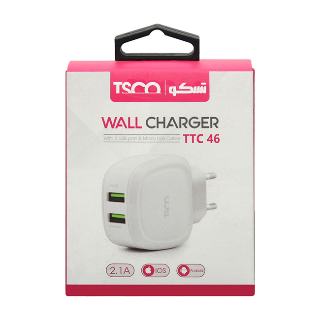 شارژر دیواری تسکو مدل TTC 46 دو پورت USB دارد که شدت جریان آن ها ۲٫۱ آمپر ، ولتاژ ورودی آن ۱۰۰-۲۴۰ ولت و ولتاژ خروجی آن ۵ ولت است.