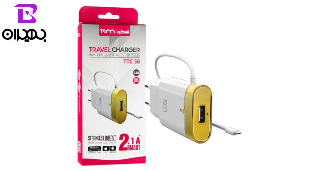 شارژر تسکو مدل TTC 50 دارای یک پورت جهت شارژ موبایل یا تبلت شما است. این شارژر دارای شدت جریان خروجی ۲٫۱ آمپر، ولتاژ ورودی ۱۱۰-۲۴۰ ولت و ولتاژ خروجی ۵ ولت می باشد. طول کابل شارژر تسکو مدل TTC 50 برابر ۱ متر است.