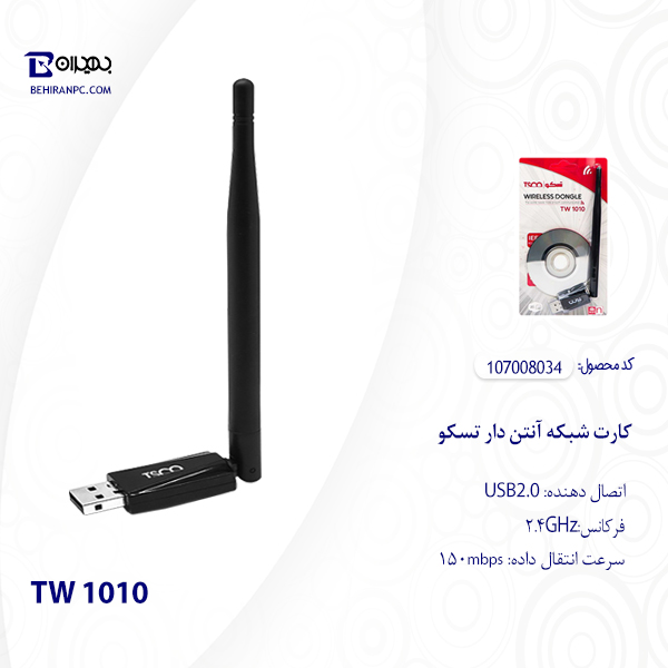 کارت شبکه تسکو مدل TW1010 آنتن دار توسط پورت USB به لپ تاپ یا کامپیوترهایی که به وای فای مجهز نیستند، متصل شده و امکان اتصال بی سیم آن ها به شبکه را فراهم می کند. این کارت شبکه سرعت و برد بالایی را ارائه می دهد.