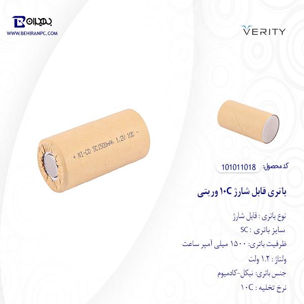باتری قابل شارژ 10C وریتی با ظرفیت 1500 میلیآمپر ساعت، از نوع باتریهای نیکل-کادمیوم (NiCd) و سایز SC است. این باتریها به دلیل طراحی ویژه و ظرفیت مناسب، برای استفاده در دستگاههای مختلف الکترونیکی و ابزارهای شارژی به کار میروند.