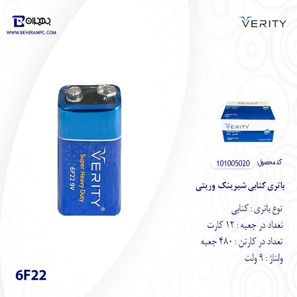 باتری کتابی شیرینک وریتی مدل 6F22 با ولتاژ 9 ولت در بسته بندی تک عددی تولید و عرضه می شود.
