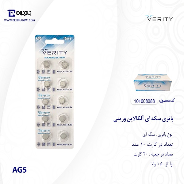 باتری سکهای AG5 وریتی با تکنولوژی آلکالاین، گزینهای مطمئن و با کیفیت برای استفاده در انواع دستگاههای کوچک و کممصرف است. این باتری با ولتاژ 1.5 ولت، توان و کارایی پایدار و مناسبی را در طول زمان ارائه میدهد و برای دستگاههایی طراحی شده که نیاز به یک منبع انرژی کوچک و قابلاعتماد دارند.