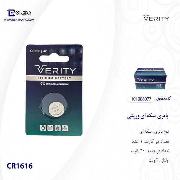 باتری سکهای CR1616 از نوع باتریهای لیتیومی است که به دلیل اندازه کوچک و ولتاژ 3 ولتی خود در بسیاری از دستگاههای الکترونیکی کوچک استفاده میشود. این باتریها به صورت تک عددی در کارتهای جداگانه بستهبندی میشوند و معمولاً در جعبههای 20 عددی توسط برندهایی مانند وریتی (Verity) عرضه میگردند.