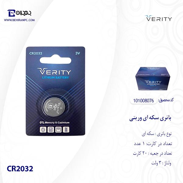 باتری سکهای CR2032 از نوع باتریهای لیتیومی است که به دلیل اندازه کوچک و ولتاژ 3 ولتی خود در بسیاری از دستگاههای الکترونیکی کوچک استفاده میشود. این باتریها به صورت تک عددی در کارتهای جداگانه بستهبندی میشوند و معمولاً در جعبههای 20 عددی توسط برندهایی مثل وریتی (Verity) عرضه میگردند.