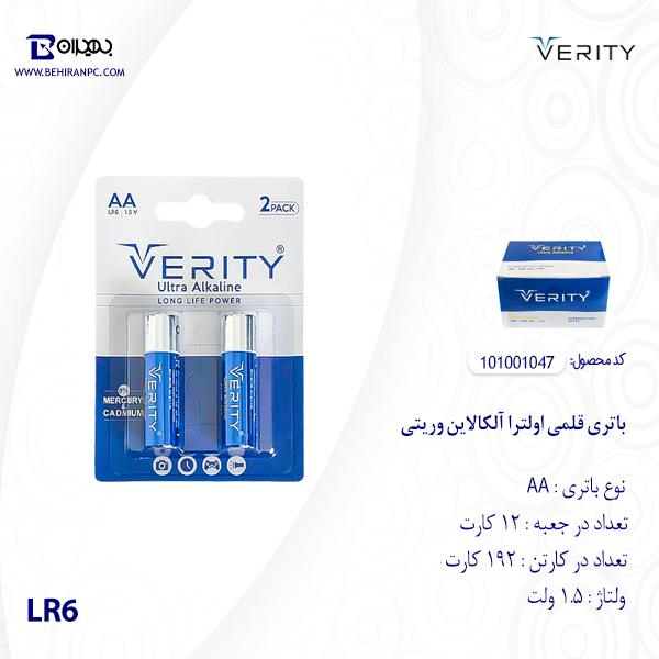 باتری قلمی اولترا آلکالاین وریتی مدل LR6 با ولتاژ 1.5 ولت در بسته بندی 2 عددی عرضه می شود. از این باتری قلمی وریتی برای کیبوردها، موس های بیسیم، برخی از دوربین ها و… نیز استفاده میشود.