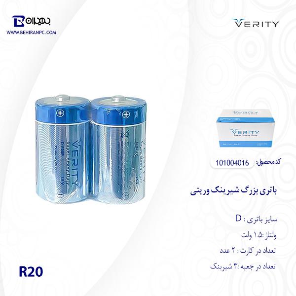 باتری بزرگ وریتی مدل R20 با ولتاژ 1.5 ولت در بسته بندی 2 عددی عرضه می شود.
