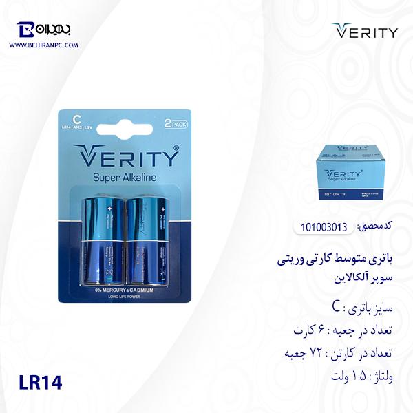 باتری متوسط سوپر آلکالاین وریتی مدل LR14 با ولتاژ 1.5 ولت در بسته بندی 2 عددی تولید و عرضه می شود.