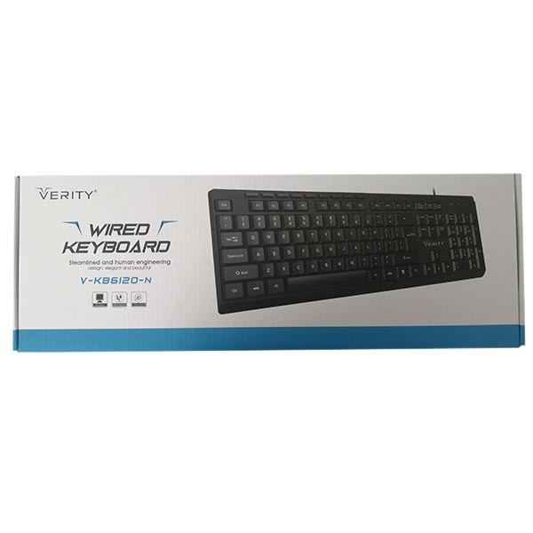 کیبورد وریتی مدل V-KB6120-N دارای 113 کلید بوده که روی هر کدام از آن ها حروف فارسی حک شده است. منبع تغذیه این کیبورد پورت USB است که به وسیله یک کابل 1.35 متری به کامپیوتر شما متصل می گردد. طول عمر آن به اندازه 10,000,000 کلیک بوده و از کیفیت ساخت بسیار بالایی برخوردار می باشد.
