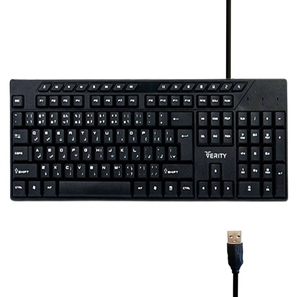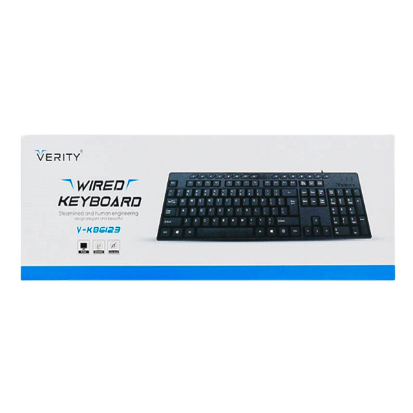 کیبورد وریتی مدل V-KB6123 به صورت باسیم و با استفاده از کابلی 1.5 متری که در سر آن کانکتور USB قرار دارد به کامپیوتر شما متصل می گردد. این محصول دارای 104 کلید بوده که بر روی آن ها حروف فارسی حک شده است. این کلید ها شامل کلید های میانبری هستند که سرعت کار را برای شما بالا می برد.