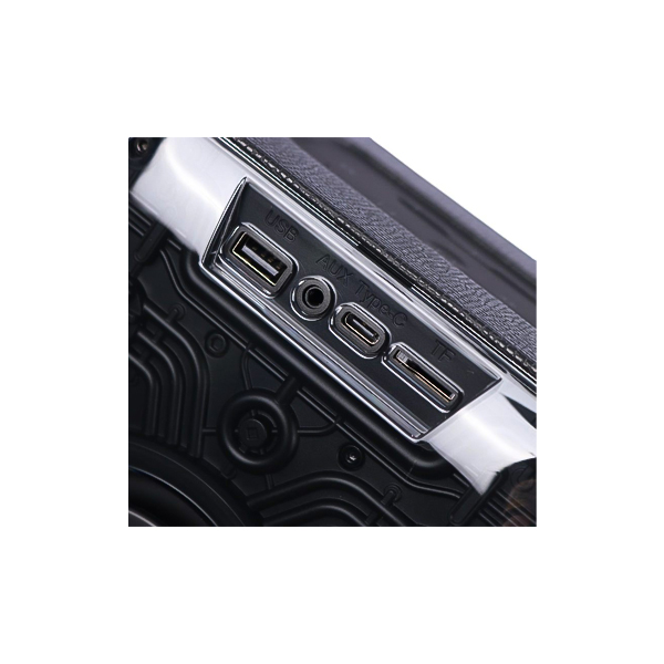 نورپردازی RGB تعبیه شده در این اسپیکر، جلوهای زیبا و جذاب به محیط شما میبخشد و حس هیجان را هنگام گوش دادن به موسیقی افزایش میدهد. همراه اسپیکر، کابل تایپ سی و کابل AUX نیز ارائه شده است تا فرآیند شارژ و اتصال به دستگاههای مختلف به سهولت انجام شود.