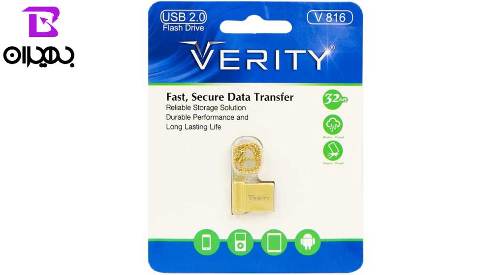 فلش مموری 32G وریتی مدل V-816 دارای رابط USB2.0 با ظرفیت 32 گیگابایت است. بدنه این فلش مموری فلزی بوده و در مقابل آب، ضربه رطوبت و شوک مقاوم است.
