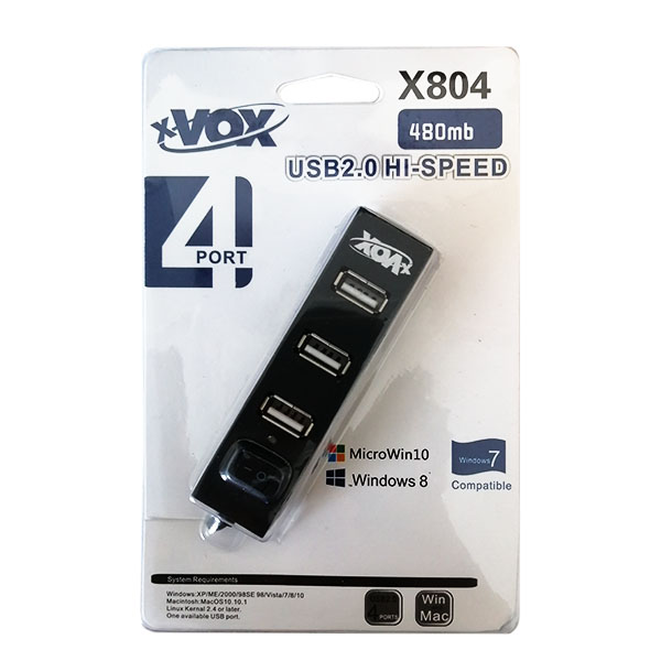 هاب X-VOX USB2.0 مدل x-804 دارای ۴ درگاه خروجی USB است که شما می توانید با اتصال ورودی USB به لپ تاپ یا کامپیوتر، لوازم جانبی بیشتری با پورت USB را به آن متصل کنید. به عنوان مثال اگر بخواهید همزمان، پرینتر، ماوس، کیبورد، فلش مموری و… را به کامپیوتر خود متصل کنید، قطعا با کمبود درگاه USB مواجه شده و در این زمان به هاب USB نیاز پیدا می کنید. این هاب دارای کلید خاموش و روشن می باشد و تا درصورت عدم نیاز بتوانید آن را خاموش و غیر فعال کنید. طول کابل آن 50 سانتی متر بوده و می توانید از آن روی میز کار خود استفاده کنید.
