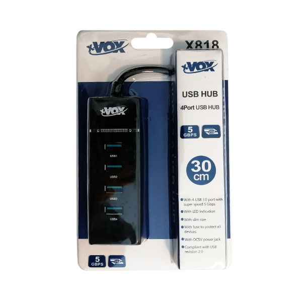 هاب X-VOX USB3.0 مدل x-818 دارای چهار پورت USB3.0 بوده و با استفاده از آن می توانید دستگاه های مختلف خود که دارای پورت USB می باشند را به کامپیوتر یا لپ تاپ خود متصل کنید. این هاب تمامی دستگاه های USB اعم از USB2.0 و USB3.0 را ساپورت می کند. دارای چراغ LED بوده که هنگام اتصال به سیستم روشن خواهد شد.