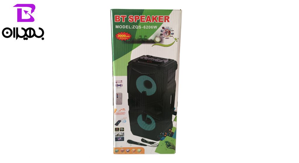 اسپیکر بلوتوثی مدل ZQS-6206W یک اسپیکر بی سیم است که توسط بلوتوثی و کابل AUX به موبایل و دستگاه های مورد نظر شما متصل می شود. وجود شیار کارت حافظه و پورت USB در بالای این محصول به شما امکان اتصال فلش مموری و رم را به شما می دهد. یک باتری با ظرفیت 3000 میلی آمپرساعت منبع تغذیه این اسپیکر می باشد. یک میکروفن و ریموت کنترل به همراه این محصول ارائه می شود.